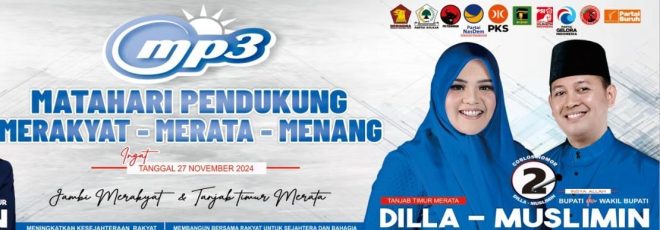 Maka dari itu mari kita sama-sama untuk memenangkan Dilla-Muslimin Tanja, dan Dilla Hikmah Sari adalah Anak Kandung dari Bapak Abdullah hick. Beliau adalah putri terbaik Tanjung Jabung Timur, begitu juga saudara saya Muslimin Tanja, beliau adalah putra terbaik Tanjung Jabung Timur, Asli putra Lambur. Dan saya juga menyampaikan maaf, karena Hj Dilla tidak bisa berlama-lama bersama kita, dan beliau ada keperluan lain yang harus dia selesaikan.” Pungkasnya. (Ambok)
